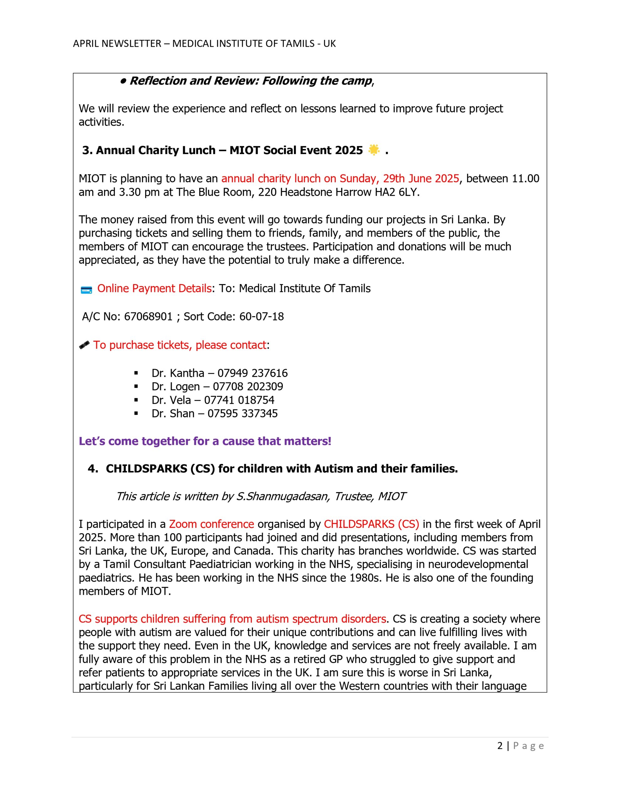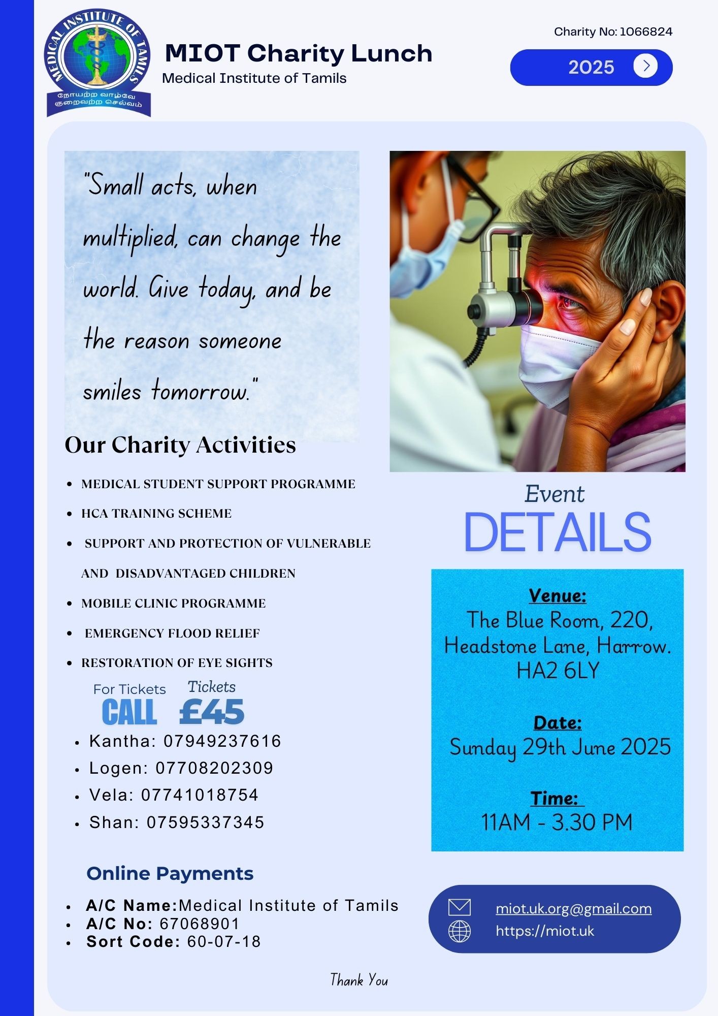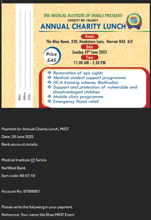 The relief of poverty, sickness and the preservation and protection of the health of the Tamil community in their homelands, in UK and elsewhere. To advance education and training in the Tamil community in the science and art of medicine.